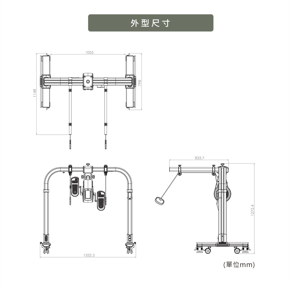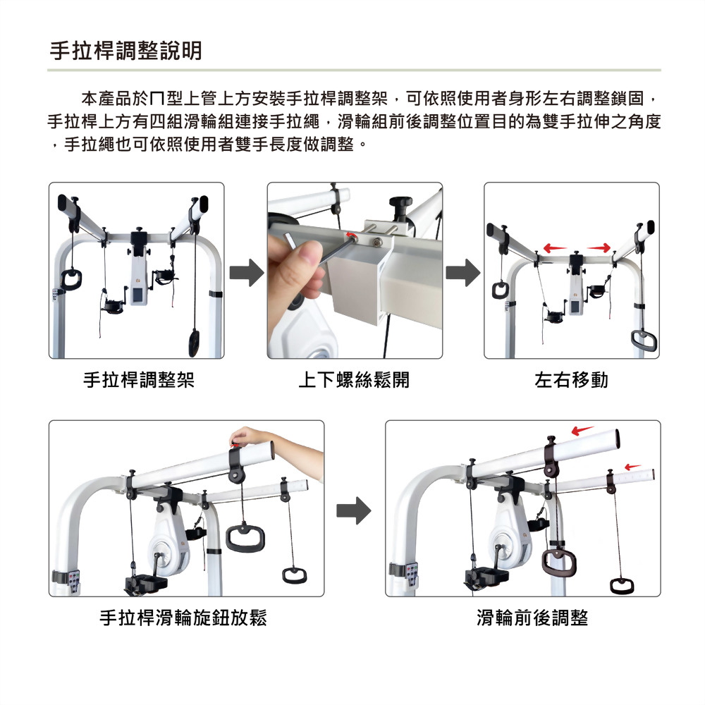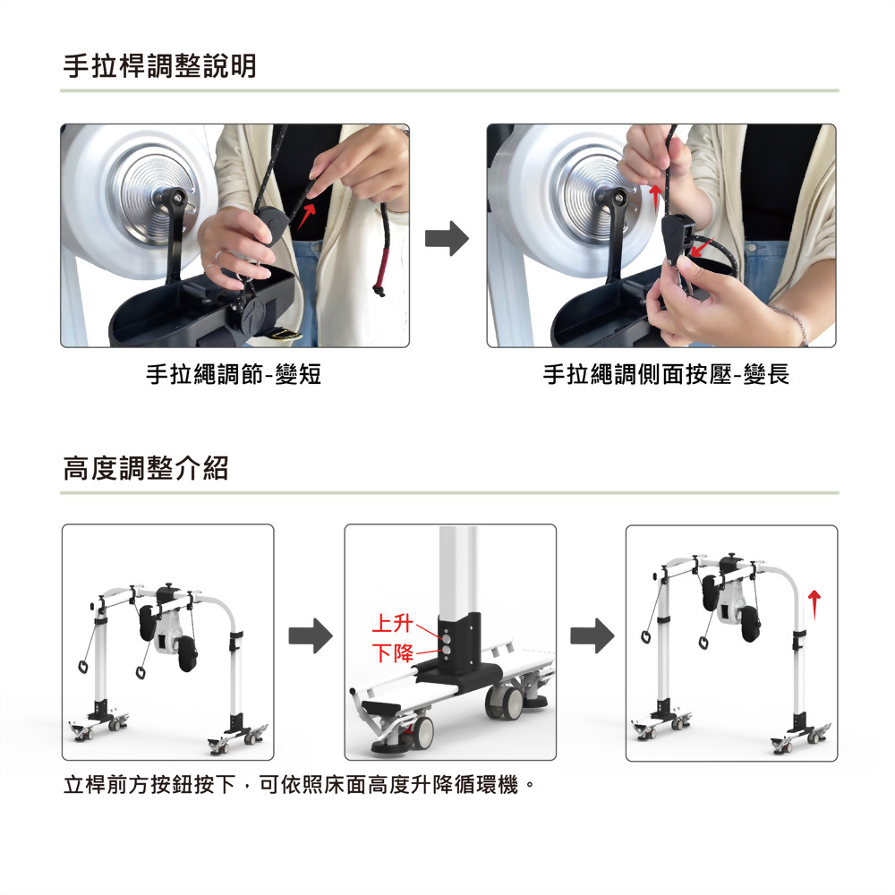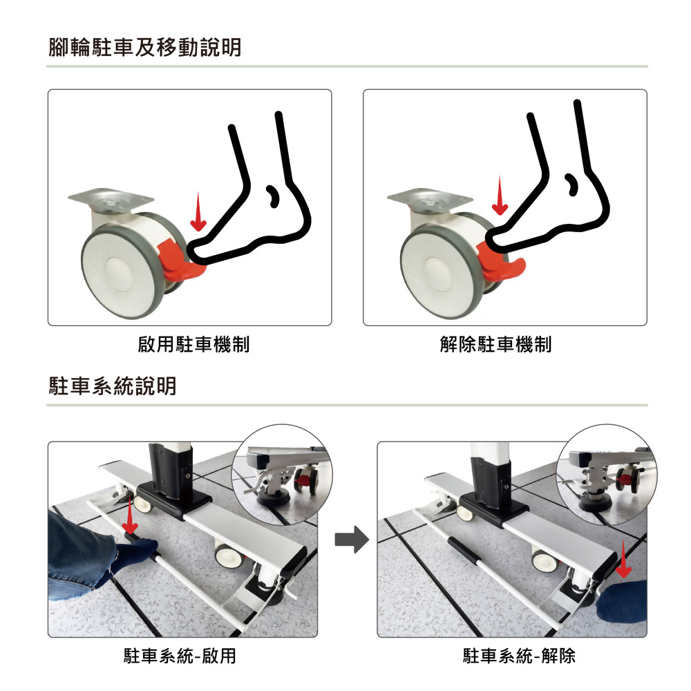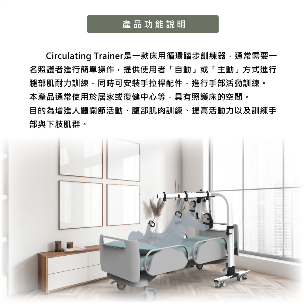 - 產品具備可移動性,當要使用循環踏步訓練時。僅需將設備移動至床尾,並將設備駐車便可以讓使用者進行訓練。