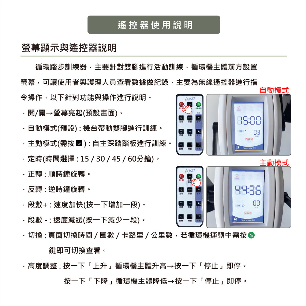 - 訓練模式可選擇自動模式(機器帶動)或是主動模式(自主踩動)。