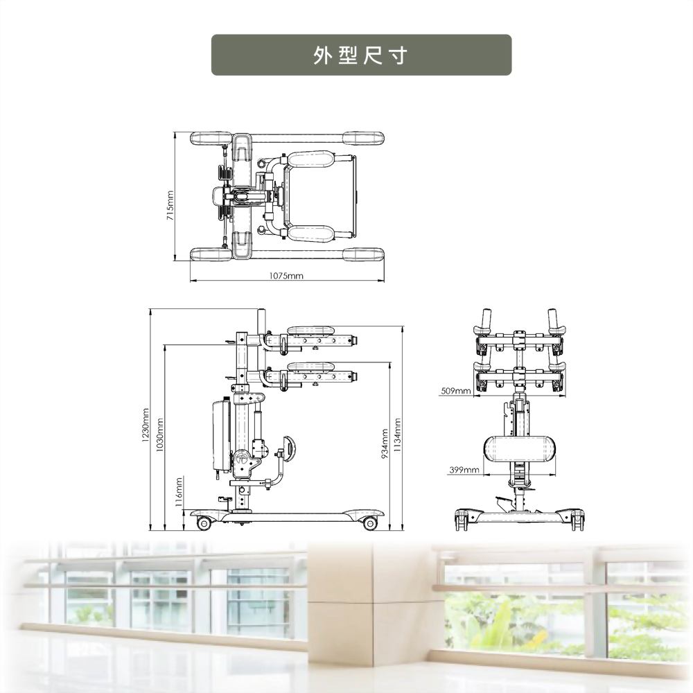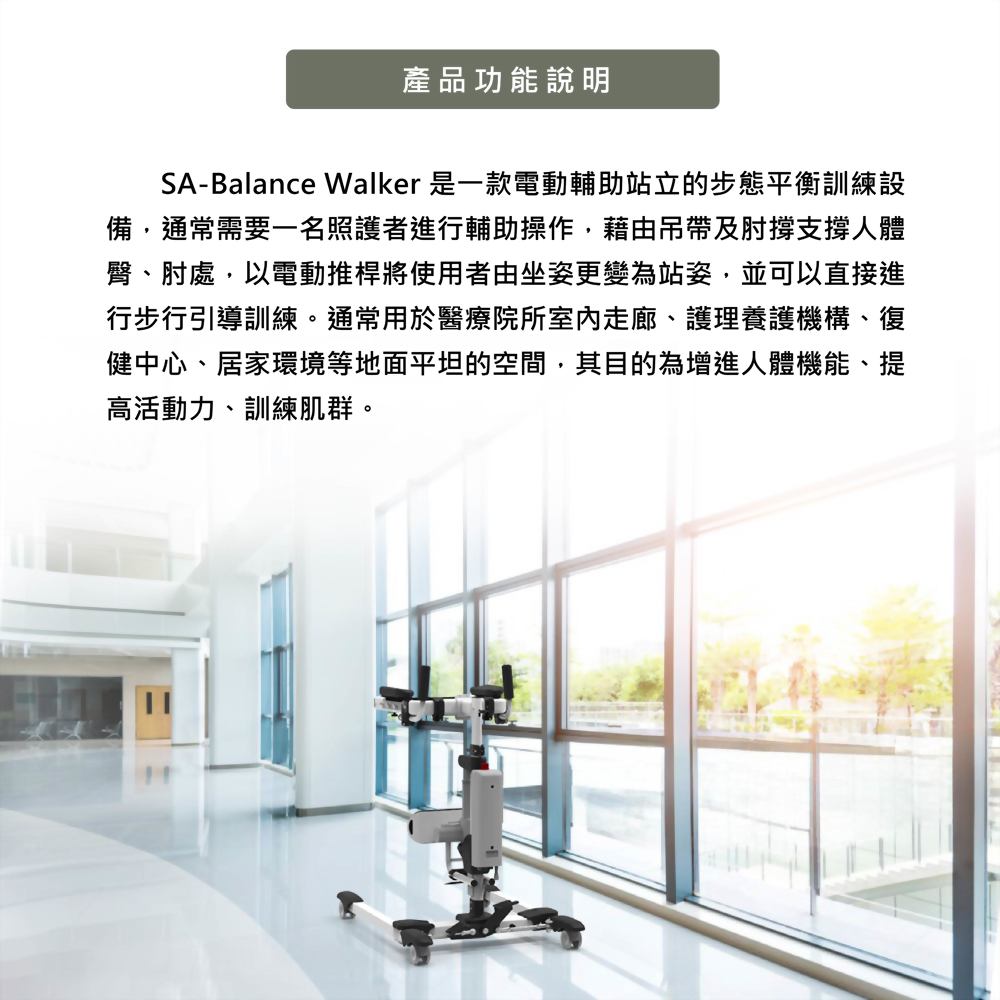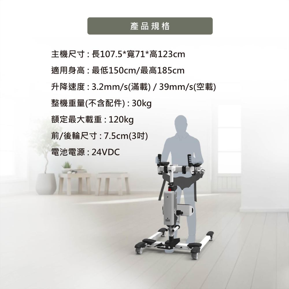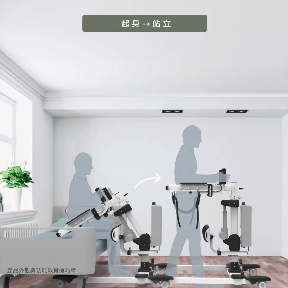 - 【腿部肌力訓練】:在站立過程中,設備會確保被照護者的腿部不會受到過度壓力,因此被照護者能在舒適的狀態下進行腿部肌力的訓練,逐步增強其站立和步行的能力。