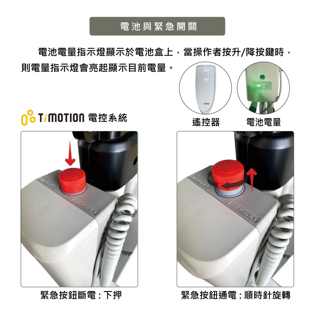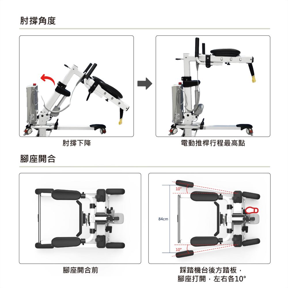 - 【電動缸系統】:設備的核心部件是電動缸系統,這一系統能夠精確地調整設備的角度與位置,協助被照護者完成從坐姿到站立的過渡。這種電動控制系統不僅可以根據使用者的具體需求調整,還能確保操作過程中的穩定性和安全性。