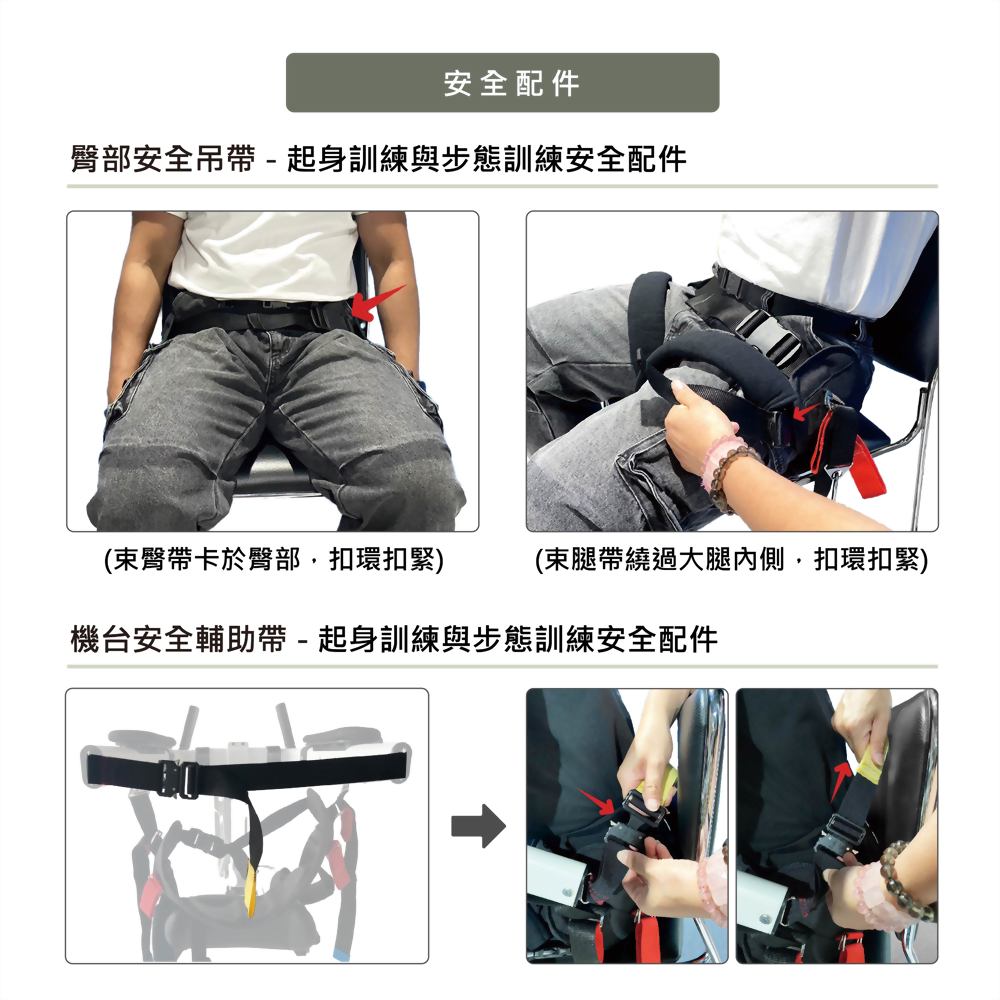- 【吊帶與膝擋板設計】:被照護者在進行訓練時,會穿戴專用吊帶,並將小腿部固定在膝擋板上。這一設計有效地減少了腿部的壓力,使被照護者在起身過程中感到更加舒適。膝擋板的設置也能提供額外的穩定支撐,防止不必要的移動或不穩定,進一步保障安全。