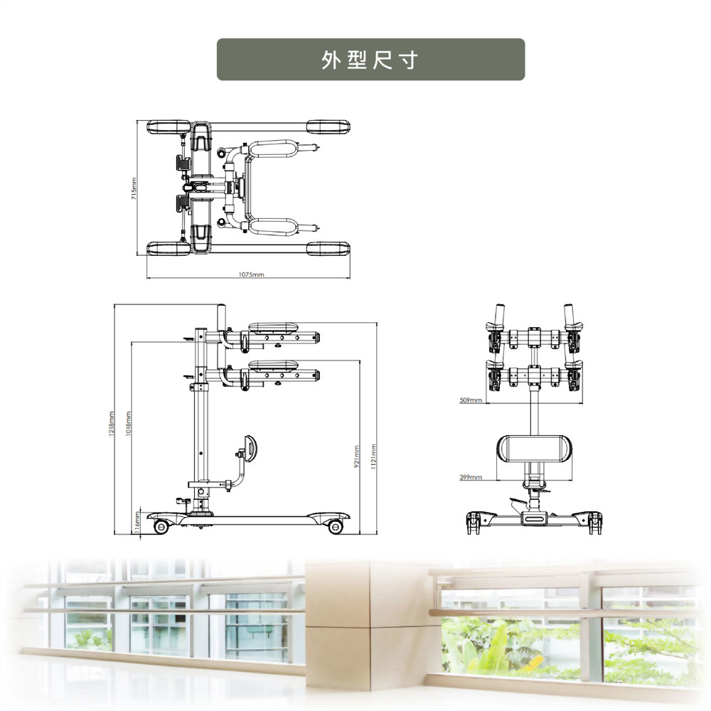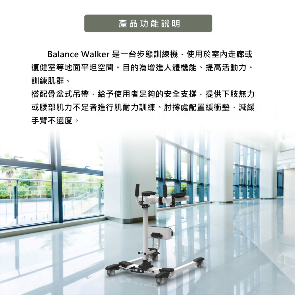 步態訓練器是一款專為被照護者設計的行走訓練設備,旨在幫助康復中的患者或老年人進行行走訓練,並確保其在訓練過程中的安全。能有效協助使用者練習步態,提升行走能力,同時降低受傷風險。