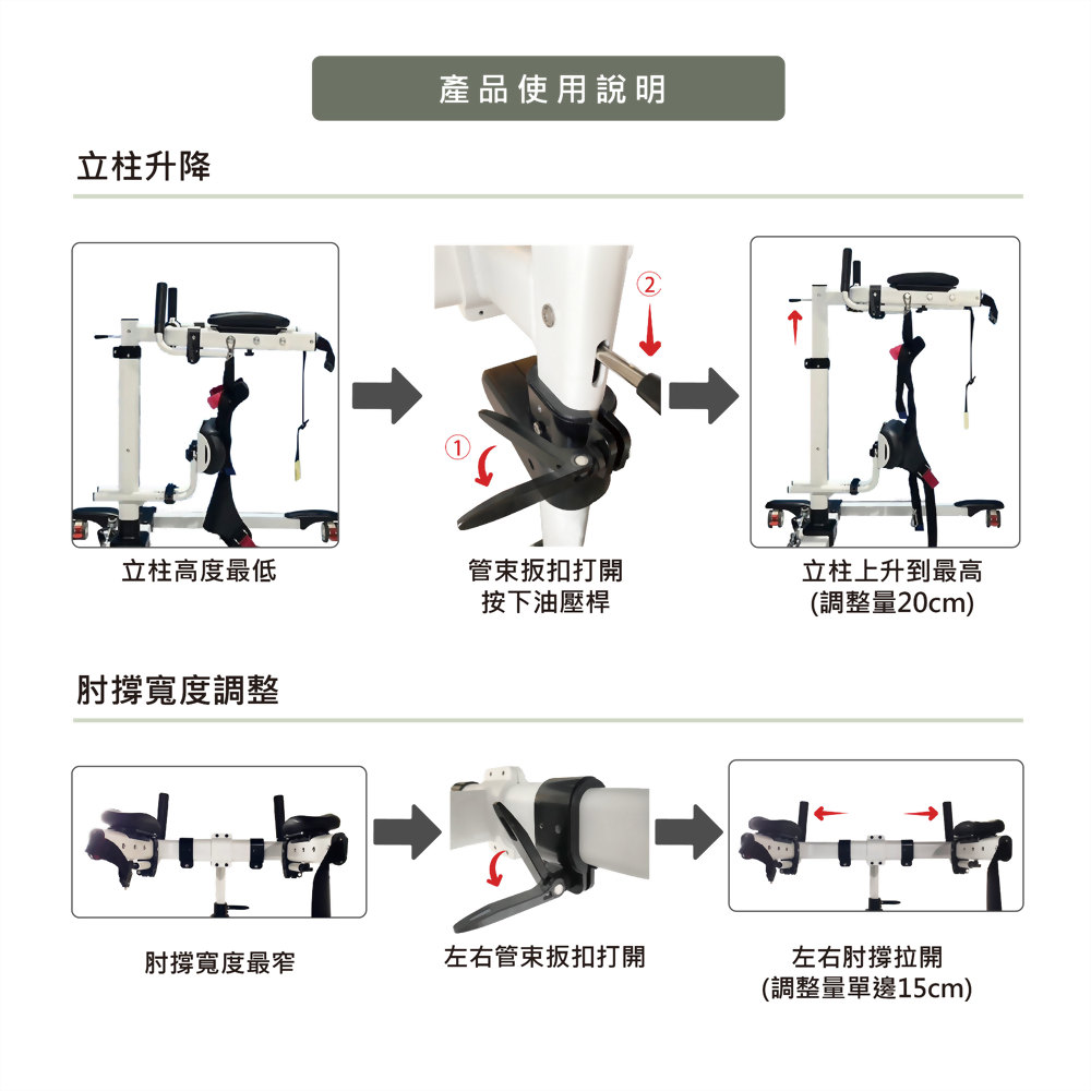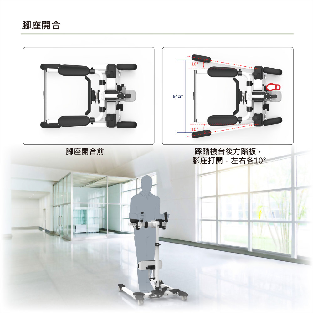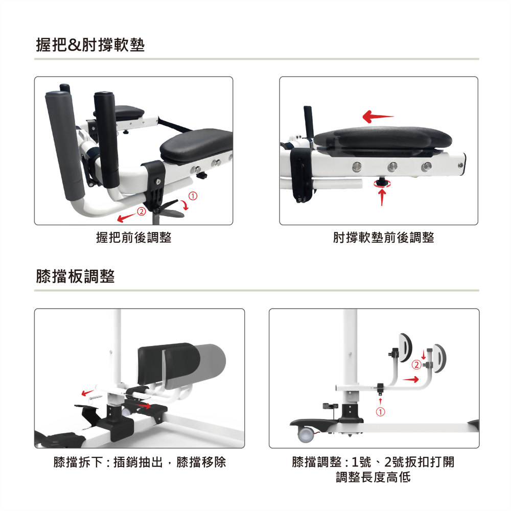 手臂支撐區域設計有可調節寬度與握把位置的功能,可根據被照護者的身型進行個性化調整,無論是手臂長度或是身體寬度,都能提供最合適的支撐,減少訓練過程中的不適感,提升舒適度與穩定性。