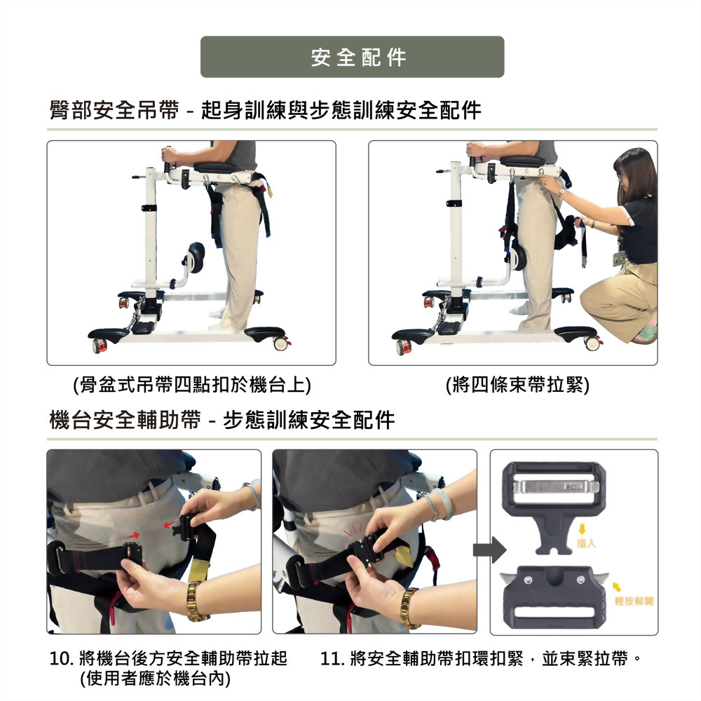 設備上設有額外的安全帶,專門防止被照護者在訓練過程中向後傾倒。這項功能進一步提高了訓練過程中的穩定性,確保使用者不會在站立或步行過程中失去重心。