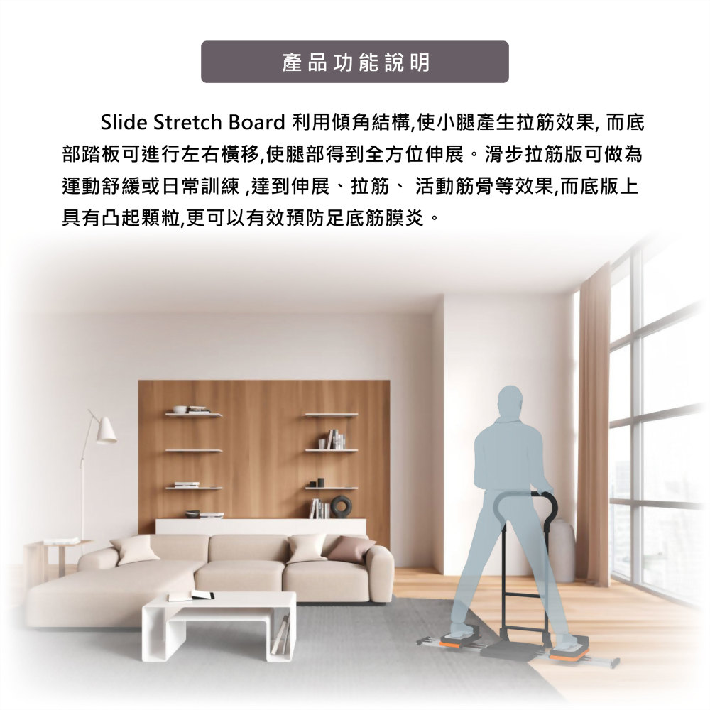 Slide Stretch Board 利用傾角結構,使小腿產生拉筋效果, 而底