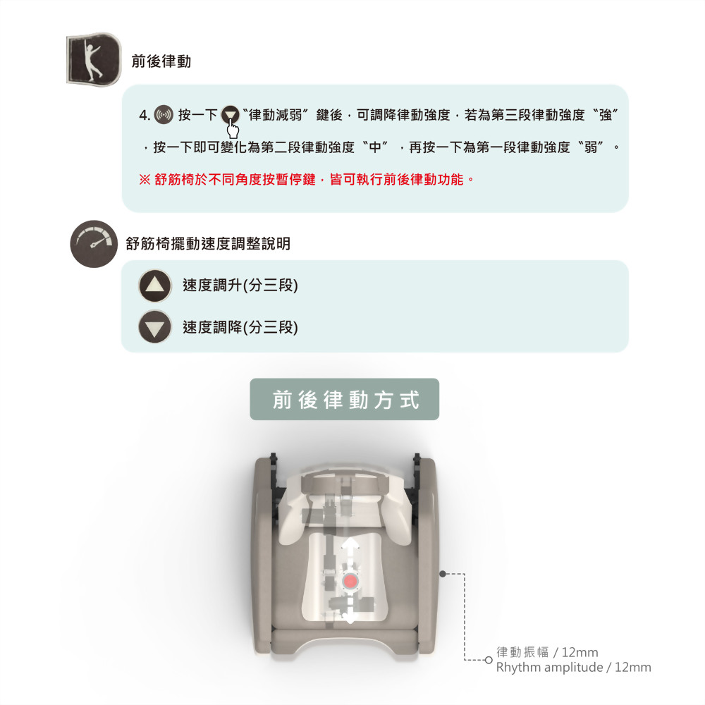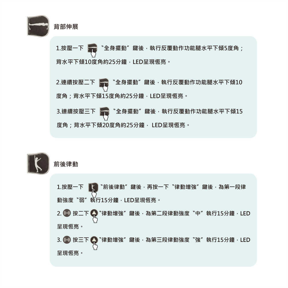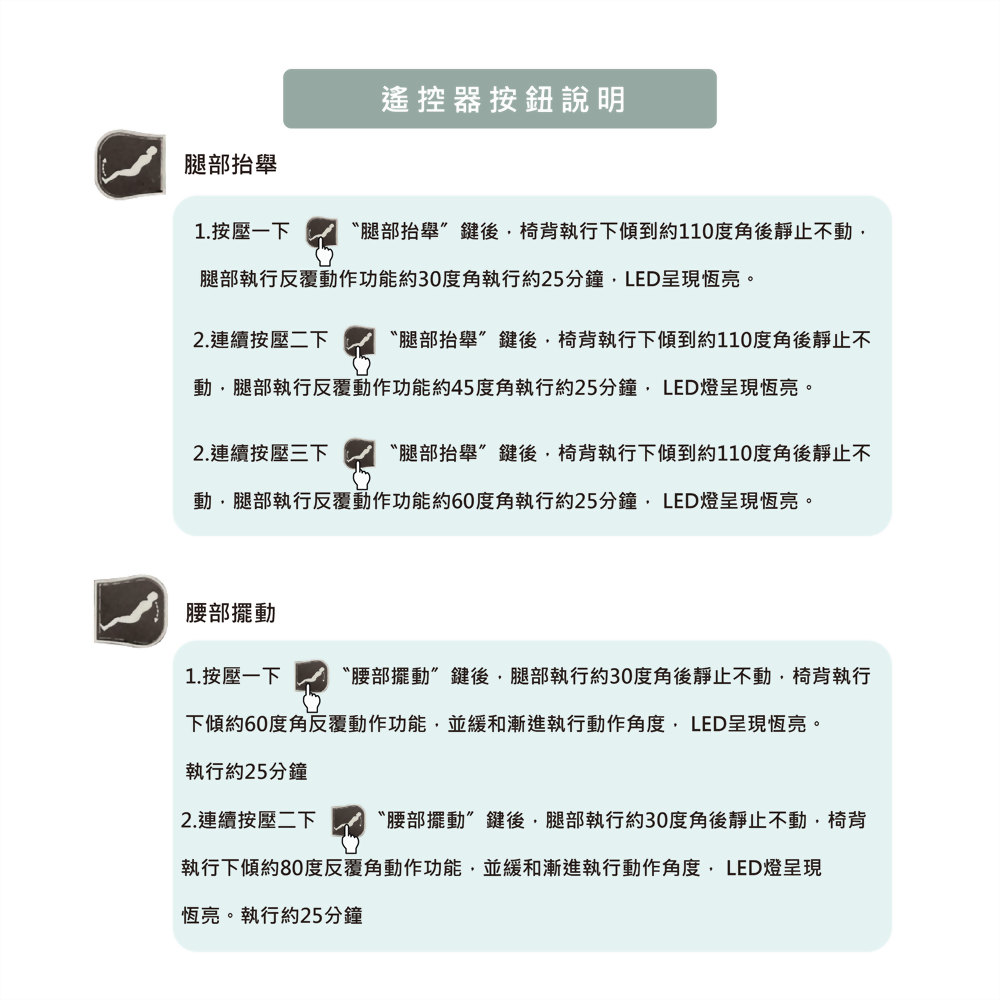 每個動作有三種強度(角度)選擇,可定時 25 分鐘後歸位。