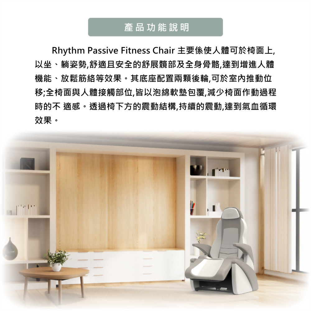 本產品能輔助使用者採坐姿、舒適的、安全的被動式運動,舒展髖部及全身,
