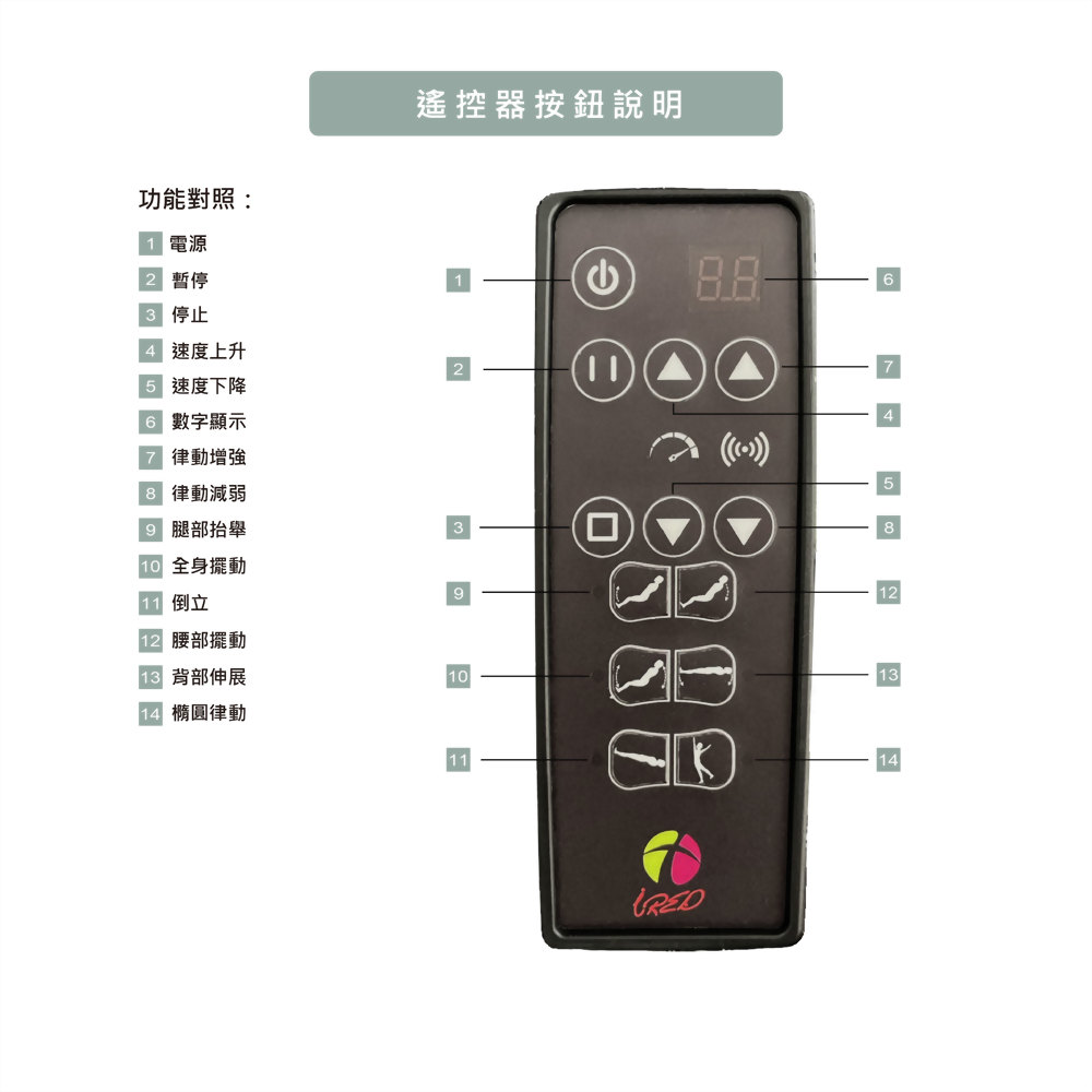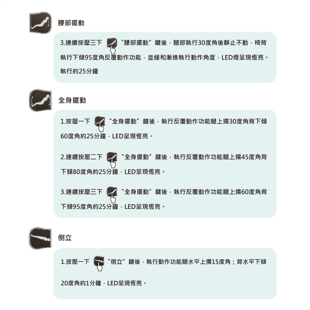 每個動作有三種強度(角度)選擇,可定時 25 分鐘後歸位。