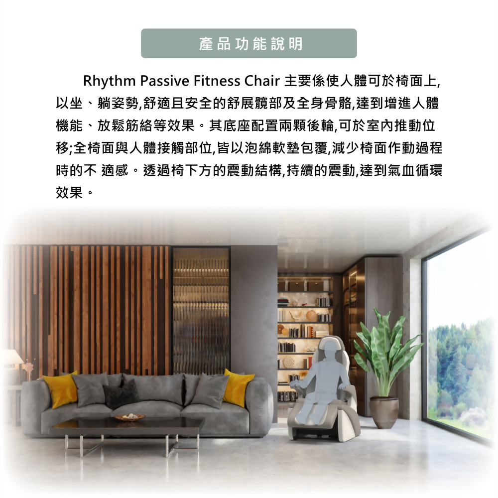 本產品能輔助使用者採坐姿、舒適的、安全的被動式運動,舒展髖部及全身,
