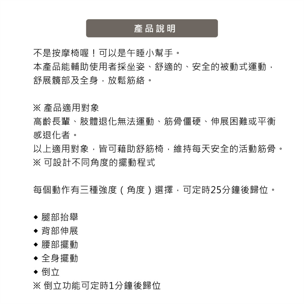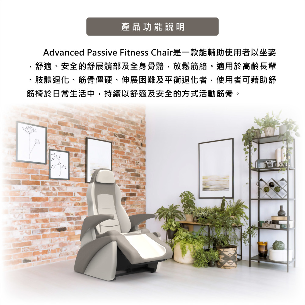 本產品能輔助使用者採坐姿、舒適的、安全的被動式運動,舒展髖部及全身,