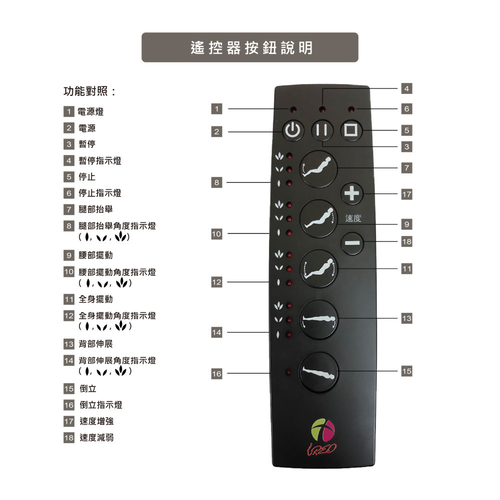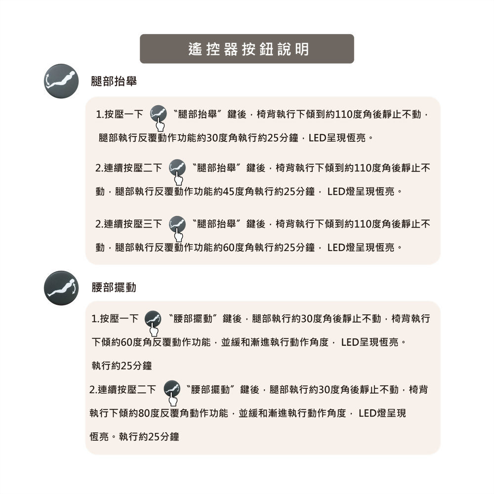 每個動作有三種強度(角度)選擇,可定時 25 分鐘後歸位。